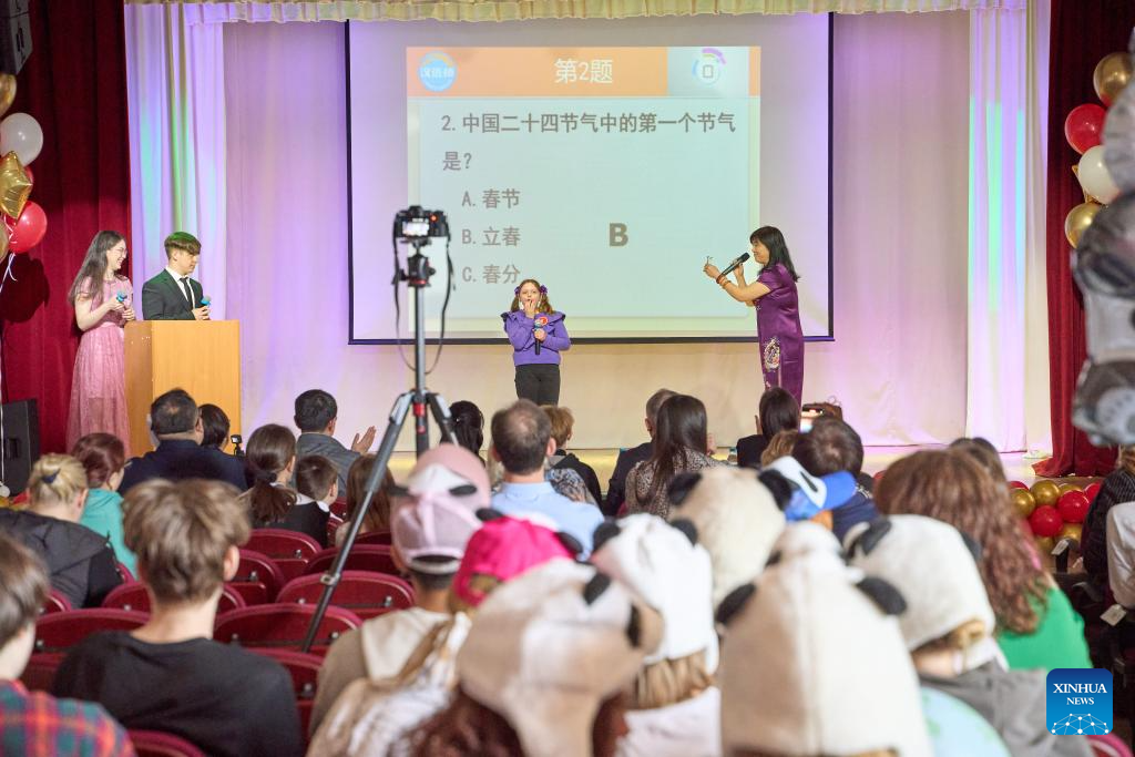 A primary school student participates in a knowledge quiz during the 2024 "Chinese Bridge" Chinese proficiency competition for primary and secondary school students in Vladivostok, Russia, April 9, 2024. The competition was held here on Tuesday. (Photo by Guo Feizhou/Xinhua)