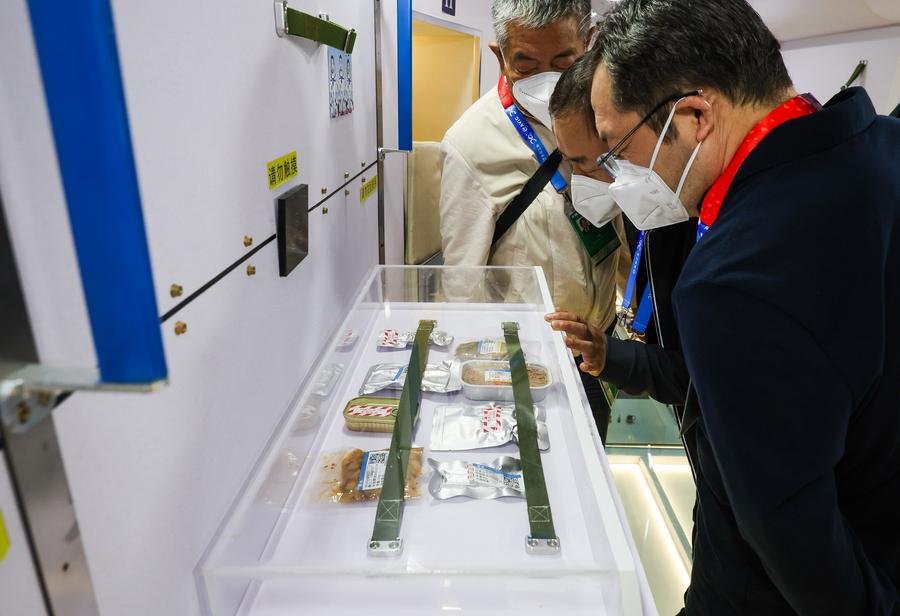 Visitors look at food supply for taikonauts in the Tianhe core module of the 1:1 model of China's space station combination showcased at the 14th China International Aviation and Aerospace Exhibition in Zhuhai, south China's Guangdong Province, Nov. 9, 2022. (Xinhua/Liu Dawei)