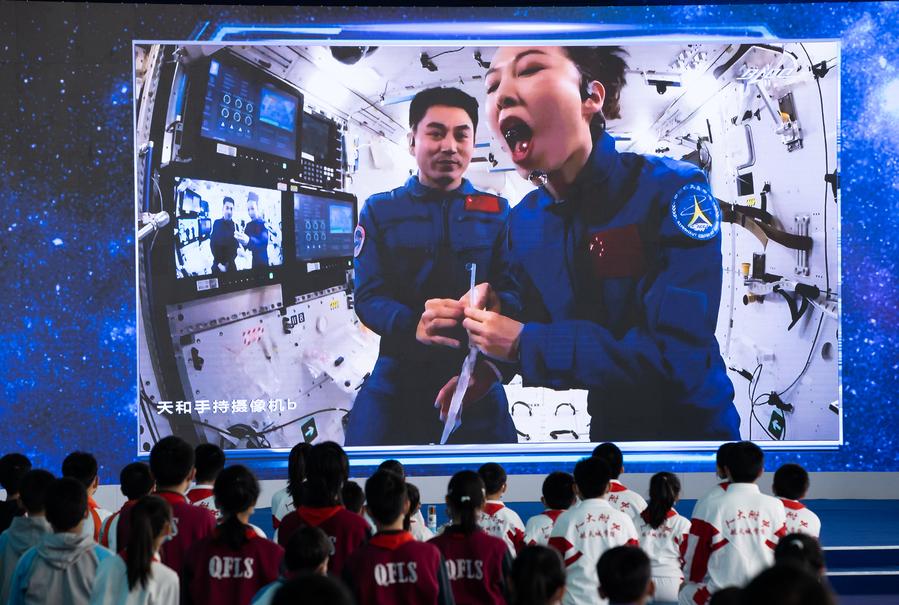 Students watch Wang Yaping (R) demonstrating drinking water in China's space station, at the China Science and Technology Museum in Beijing, capital of China, Dec. 9, 2021. (Xinhua/Jin Liwang)