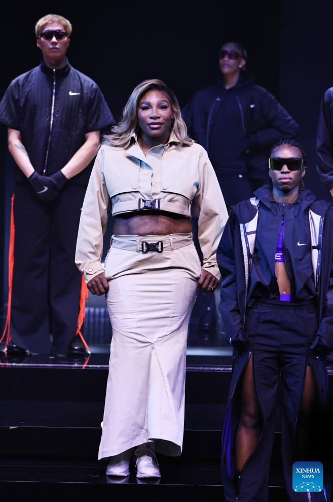 Tennis player Serena Williams (C) of the United State presents Nike Olympics Products during a Paris Olympics kits unveiling event held by Nike in Paris, France, April 11, 2024. (Xinhua/Gao Jing)