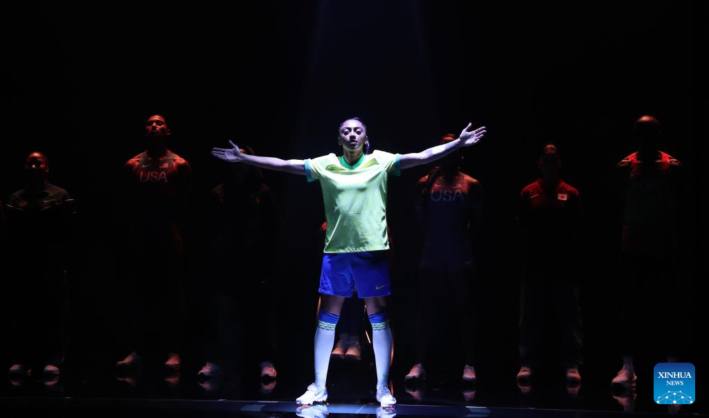 Football player Kerolin Nicoli of Brazil presents Nike Olympics Products during a Paris Olympics kits unveiling event held by Nike in Paris, France, April 11, 2024. (Xinhua/Gao Jing)