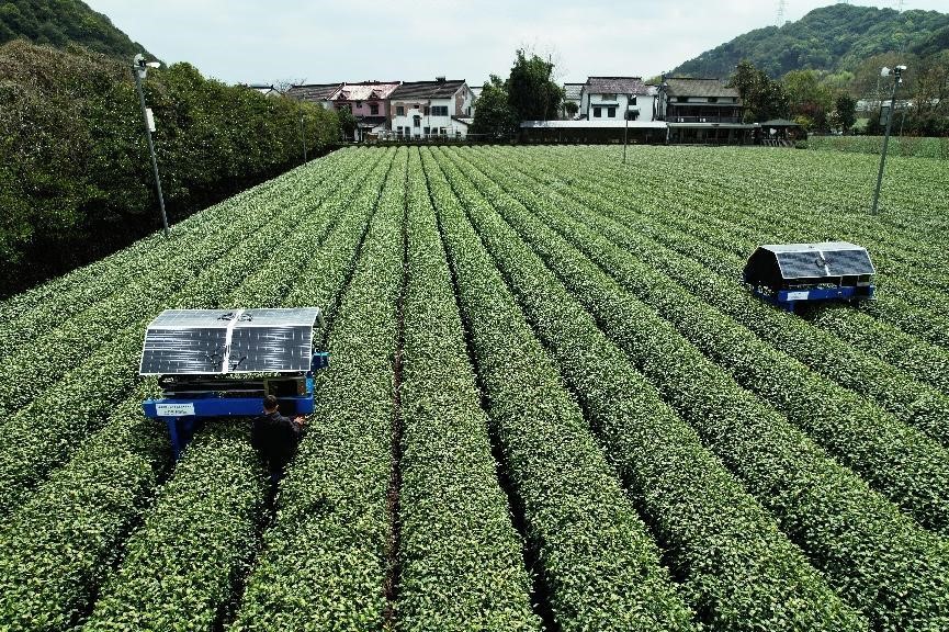 Artificial intelligence-enabled tea pickers pick tea in a tea garden in Xihu district, Hangzhou, east China's Zhejiang province, March 27, 2024. (Photo by Long Wei/People's Daily)