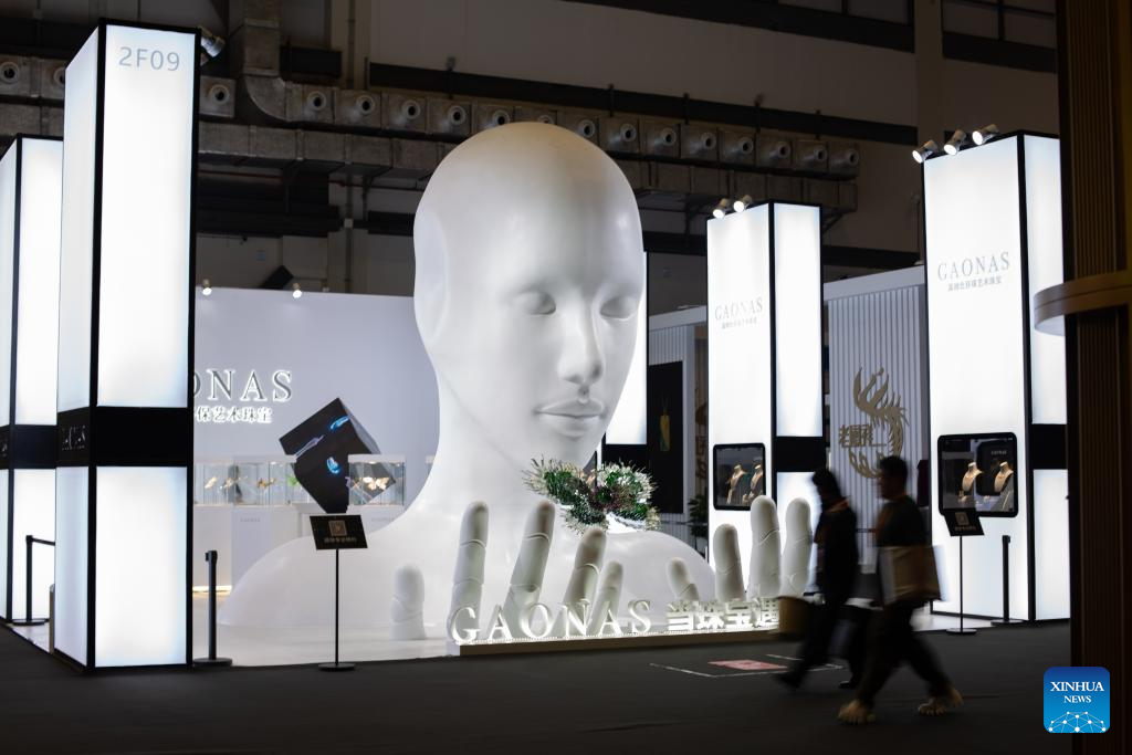 A jewelry booth is pictured at the Hainan International Convention and Exhibition Center, the main venue for the upcoming fourth China International Consumer Products Expo, in Haikou, south China's Hainan Province, April 12, 2024. The fourth China International Consumer Products Expo will open on Saturday in Haikou, the capital city of south China's Hainan Province.