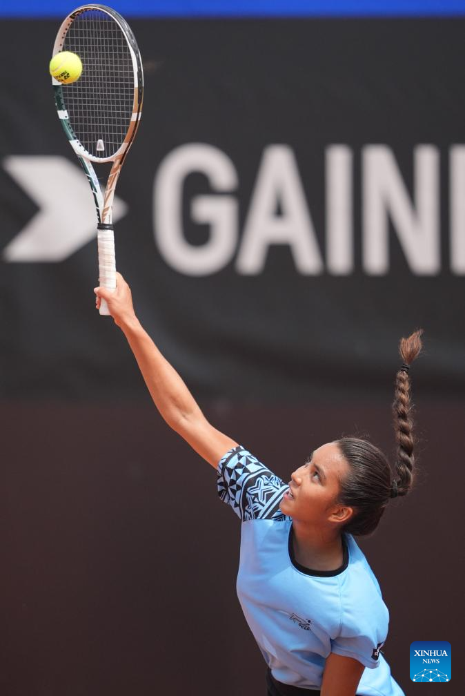 Mehetia Boosie of Pacific Oceania serves the ball during the women's singles match against Guo Hanyu of China at the Billie Jean King Cup 2024 tennis tournament Asia-Oceania Group I match in Changsha, central China's Hunan Province, April 12, 2024. (Xinhua/Xue Yuge)