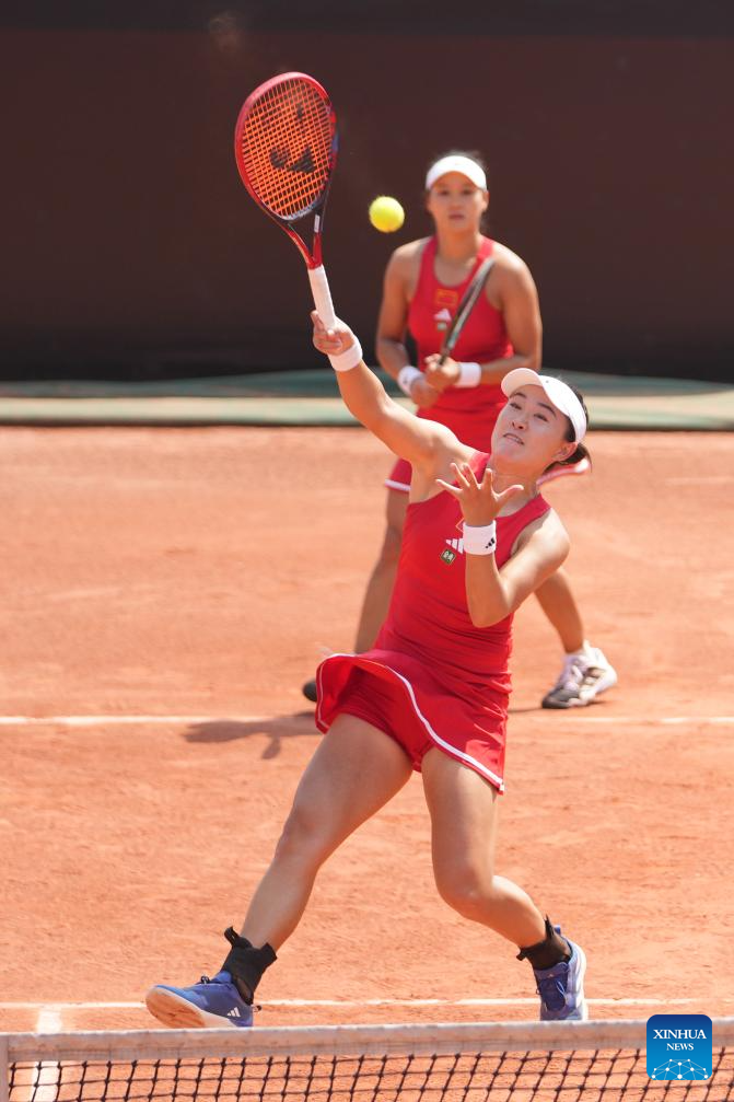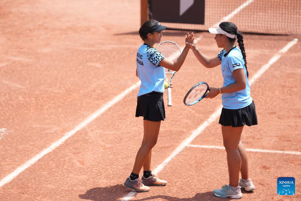 Guo Hanyu (L)/Zhu Lin of China compete during the women's doubles match against Mehetia Boosie/ Eleanor Schuster of Pacific Oceania at the Billie Jean King Cup 2024 tennis tournament Asia-Oceania Group I match in Changsha, central China's Hunan Province, April 12, 2024. (Xinhua/Xue Yuge)