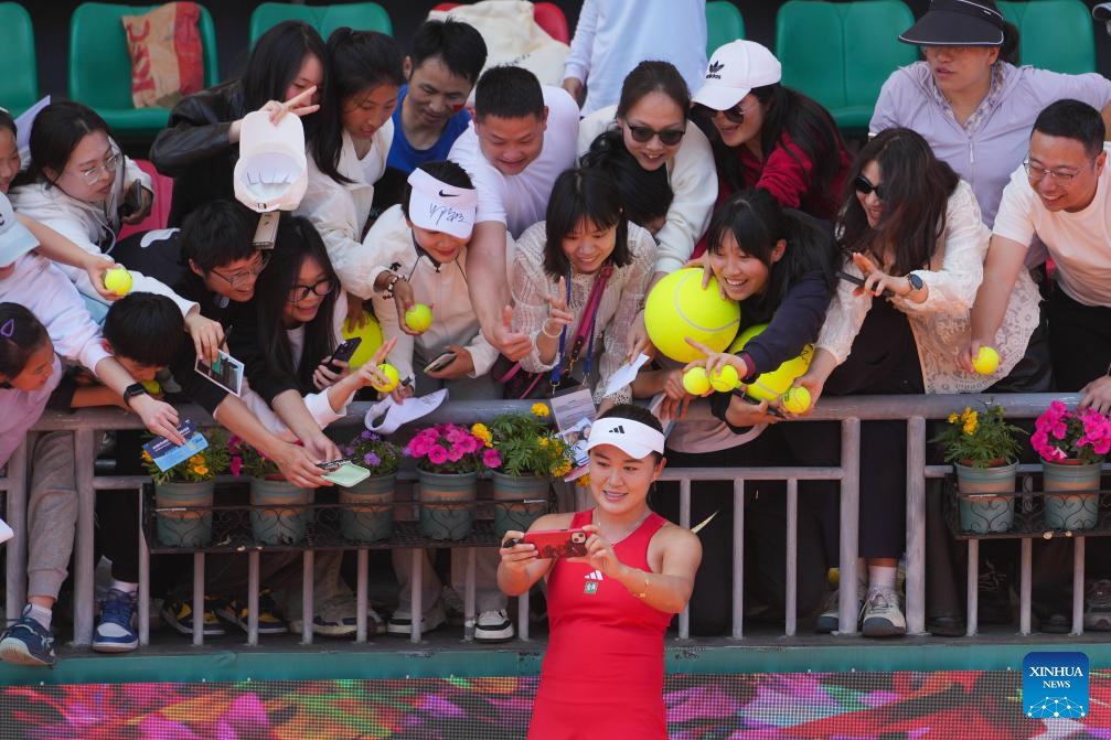 Zhu Lin of China takes selfies with audience after the women's singles match against Eleanor Schuster of Pacific Oceania at the Billie Jean King Cup 2024 tennis tournament Asia-Oceania Group I match in Changsha, central China's Hunan Province, April 12, 2024. (Xinhua/Xue Yuge)