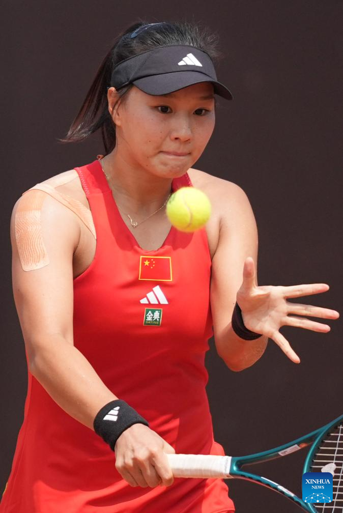 Zhu Lin of China returns the ball during the women's singles match against Eleanor Schuster of Pacific Oceania at the Billie Jean King Cup 2024 tennis tournament Asia-Oceania Group I match in Changsha, central China's Hunan Province, April 12, 2024. (Xinhua/Xue Yuge)