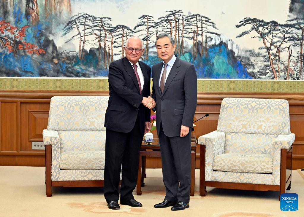 Chinese Foreign Minister Wang Yi, also a member of the Political Bureau of the Communist Party of China Central Committee, meets with Wolfgang Ischinger, chairman of the Munich Security Conference (MSC) Foundation, in Beijing, capital of China, April 12, 2024. (Xinhua/Yin Bogu)