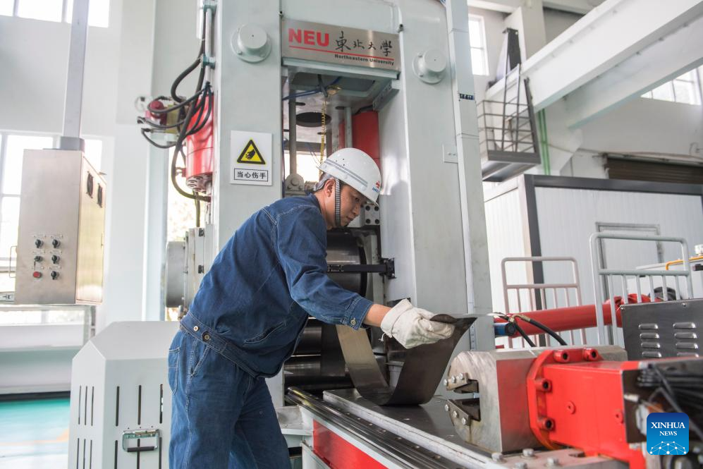 A technician picks up newly-processed 0.015mm ultra-thin high temperature alloy steel strip at a lab under Pangang Group Research Institute Co., Ltd. in Panzhihua City, southwest China's Sichuan Province, April 10, 2024. (Xinhua/Zhang Haofu)