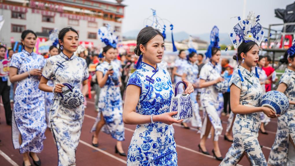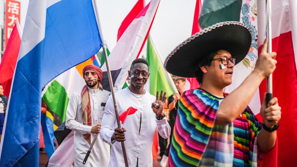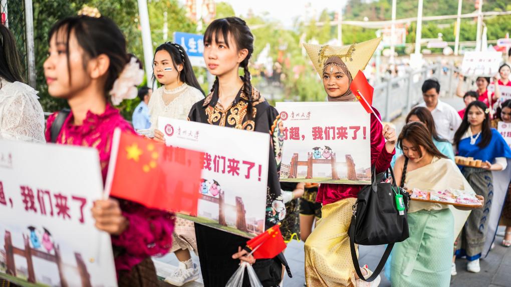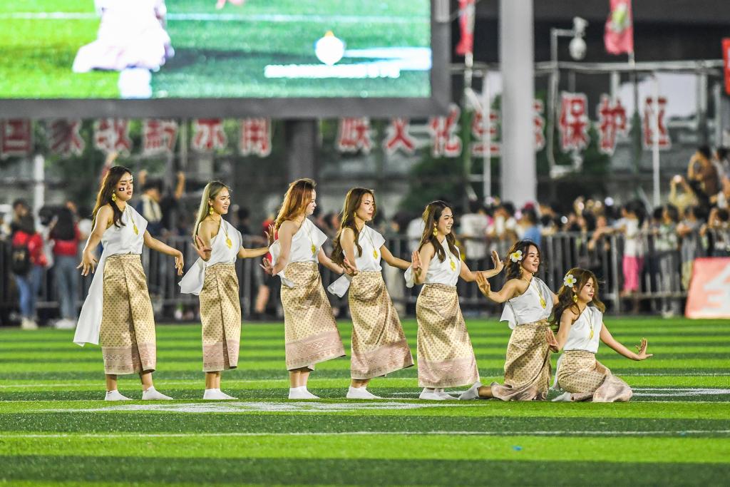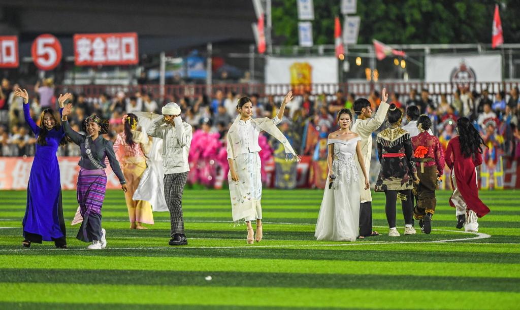 International students from Guizhou University greet spectators after their performance during a friendly football match in Rongjiang County of southwest China's Guizhou Province, April 13, 2024.(Xinhua/Tao Liang)