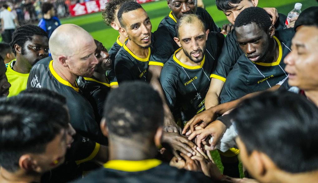 Players of Guizhou University international students football team cheer up before the start of a friendly football match in Rongjiang County of southwest China's Guizhou Province, April 13, 2024.(Xinhua/Tao Liang)