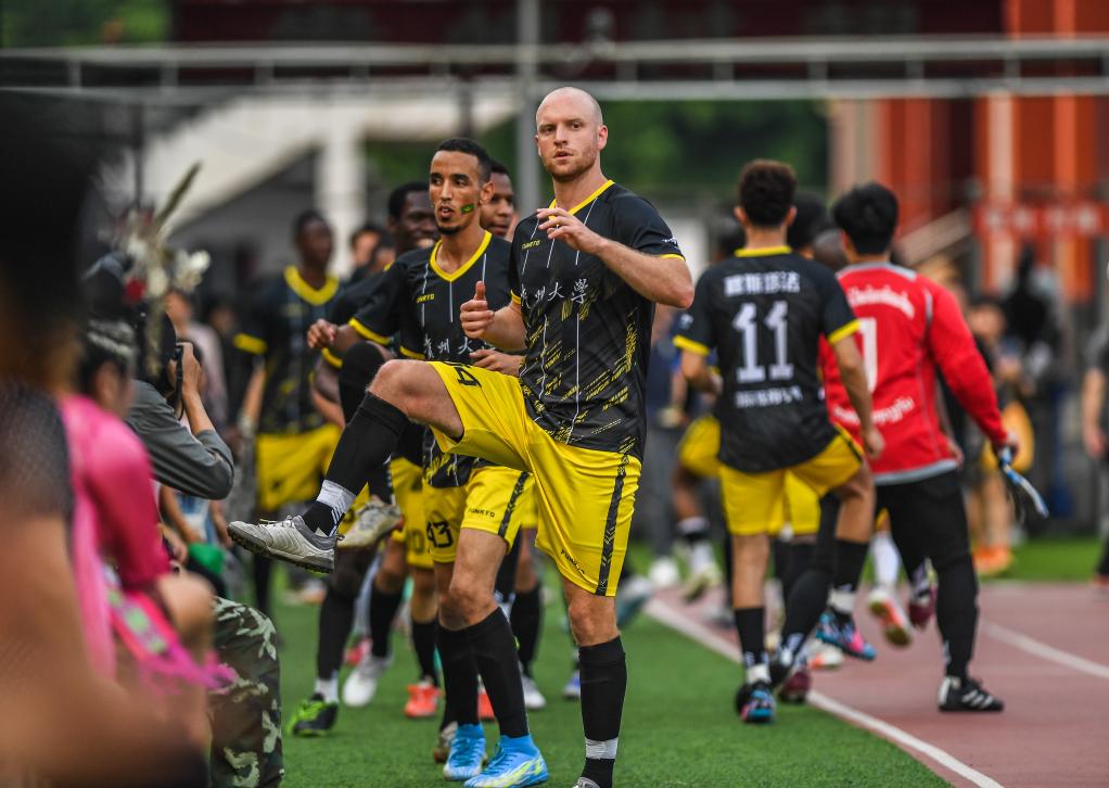 International students from Guizhou University perform during a friendly football match in Rongjiang County of southwest China's Guizhou Province, April 13, 2024.(Xinhua/Tao Liang)