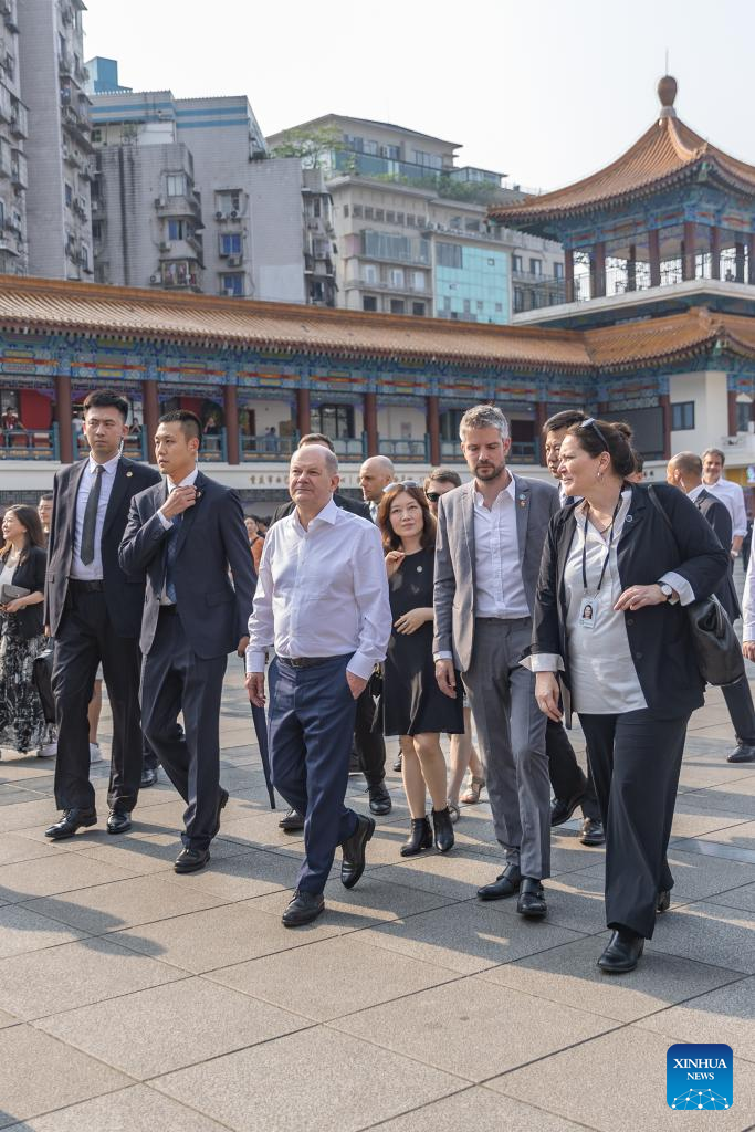 Federal Chancellor of Germany Olaf Scholz visits Yuzhong District of southwest China's Chongqing Municipality, April 14, 2024. Scholz arrived in Chongqing Municipality on Sunday to kick off his three-day official visit to China at the invitation of Chinese Premier Li Qiang. (Xinhua/Huang Wei)