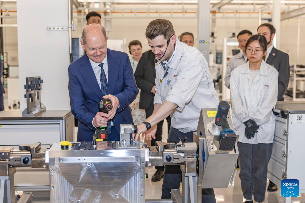 Federal Chancellor of Germany Olaf Scholz visits Bosch Hydrogen Powertrain Systems (Chongqing) Co., Ltd. in Jiulongpo District of southwest China's Chongqing Municipality, April 14, 2024. Scholz arrived in Chongqing Municipality on Sunday to kick off his three-day official visit to China at the invitation of Chinese Premier Li Qiang. (Xinhua/Huang Wei)