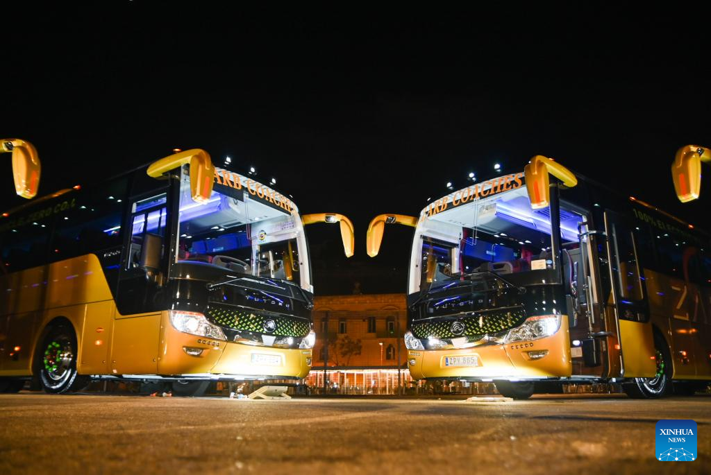 Electric buses produced by the Chinese manufacturer Yutong Bus Co., Ltd. are pictured in Valletta, Malta, on April 12, 2024. (Photo by Jonathan Borg/Xinhua)
