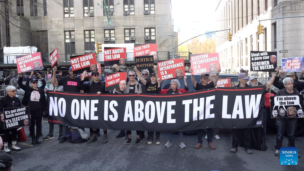 Former U.S. President Donald Trump's supporters show up at Collect Pond Park in front of the building of New York County Criminal Court in New York, the United States, on April 15, 2024. Former U.S. President Donald Trump on Monday appeared in a criminal court in Manhattan, New York City, in the hush money case, making him the first former U.S. president to stand a criminal trial. (Xinhua/Liu Yanan)