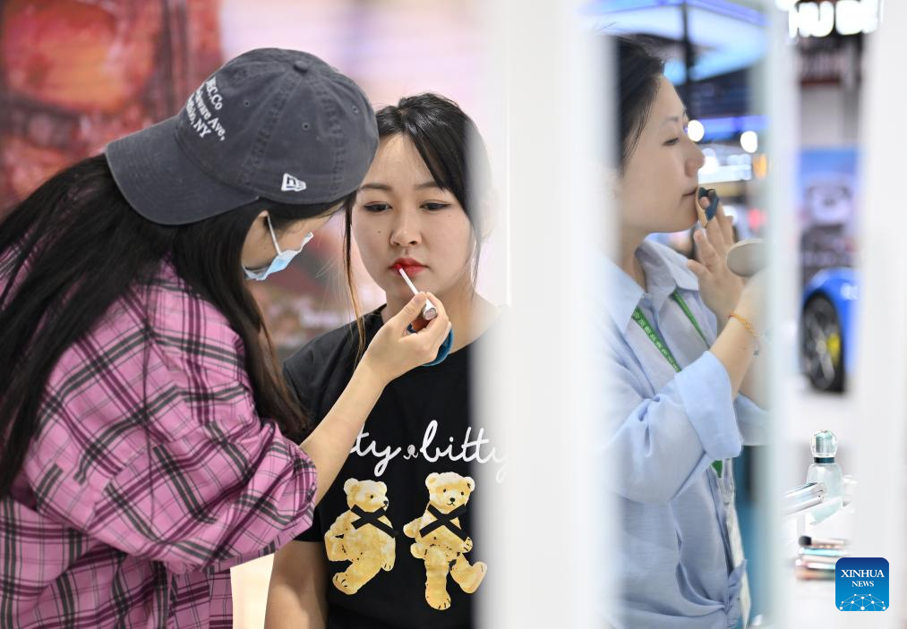 A visitor tries a cosmetic product at the fourth China International Consumer Products Expo (CICPE) in Haikou, capital city of south China's Hainan Province, April 15, 2024. The Expo, which started Saturday and lasts till April 18, is China's only national-level exhibition featuring consumer products and also the largest consumer expo in the Asia-Pacific region. (Xinhua/Guo Cheng)