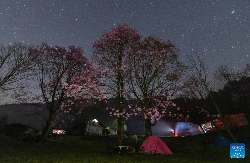 Blooming magnolia flowers are pictured under the starry sky in Cangwangzhai Village of Yongsheng Town in Jiangyou, southwest China's Sichuan Province, April 13, 2024. (Xinhua/Jiang Hongjing)