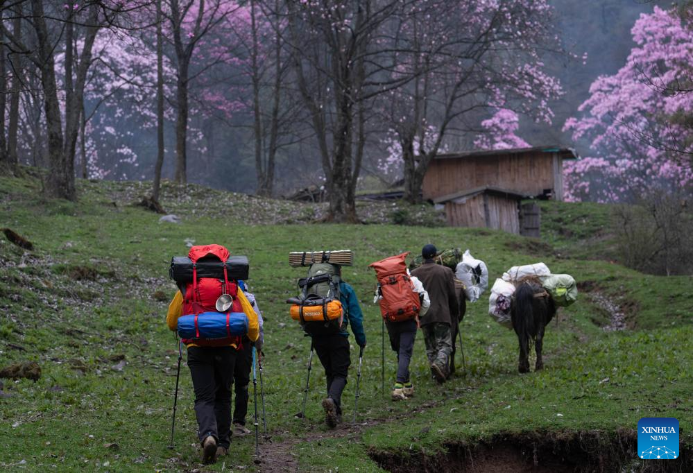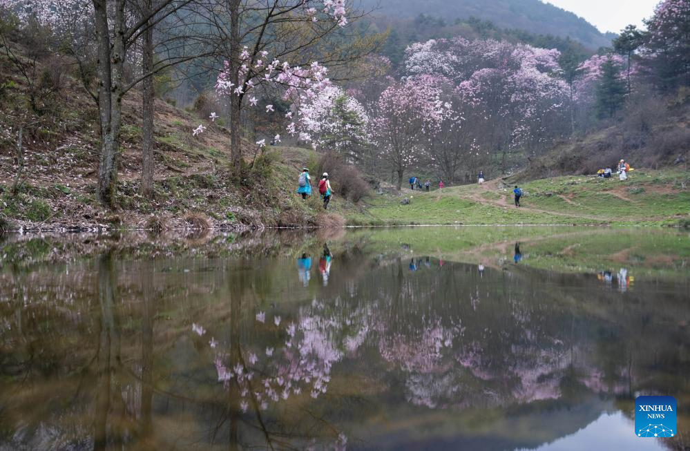 Tourists are pictured amid blooming magnolia flowers in Cangwangzhai Village of Yongsheng Town in Jiangyou, southwest China's Sichuan Province, April 14, 2024. (Xinhua/Jiang Hongjing)