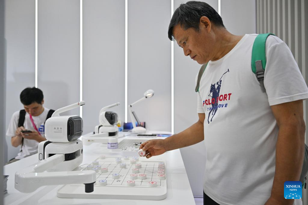 A visitor plays Chinese chess with an artificial intelligence (AI) robot at the fourth China International Consumer Products Expo (CICPE) in Haikou, capital city of south China's Hainan Province, April 15, 2024. At the ongoing expo in Hainan, AI technology products have attracted numerous visitors interested in smart innovations. (Xinhua/Guo Cheng)
