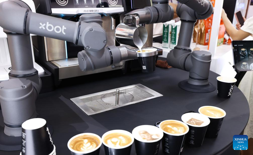 An automatic coffee machine makes coffee for visitors at the fourth China International Consumer Products Expo (CICPE) in Haikou, capital city of south China's Hainan Province, April 16, 2024. At the ongoing expo in Hainan, AI technology products have attracted numerous visitors interested in smart innovations. (Xinhua/Yang Guanyu)