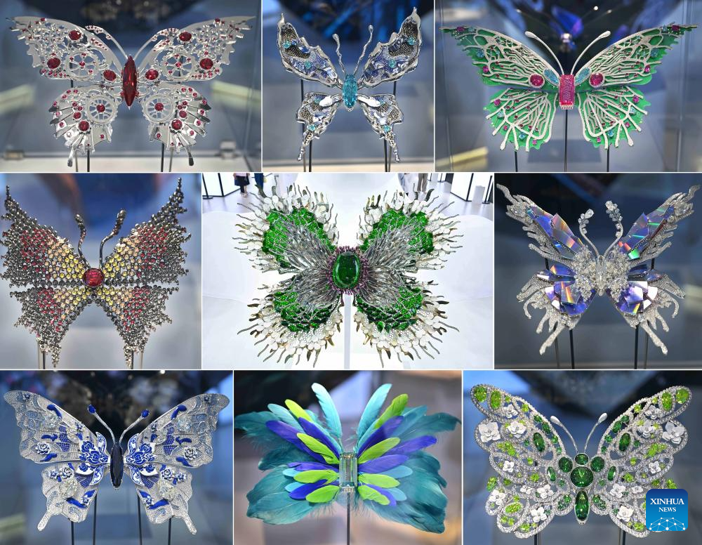 This combo photo taken on April 16, 2024 shows jewelry designed by artificial intelligence (AI) at the fourth China International Consumer Products Expo (CICPE) in Haikou, capital city of south China's Hainan Province. At the ongoing expo in Hainan, AI technology products have attracted numerous visitors interested in smart innovations. (Xinhua/Guo Cheng)