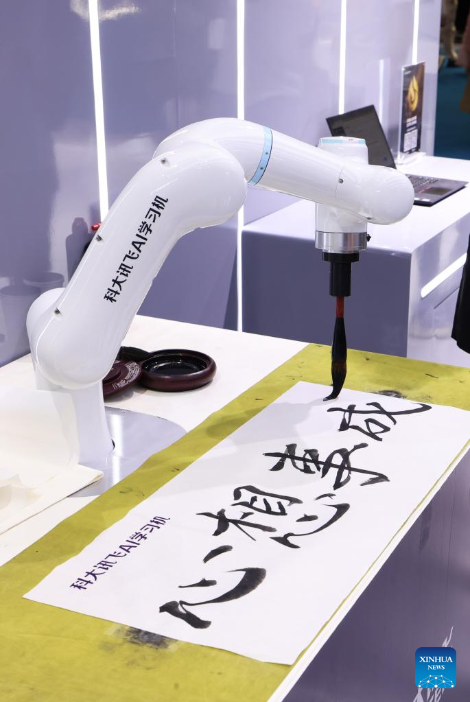 An artificial intelligence (AI) robot writes calligraphy at the fourth China International Consumer Products Expo (CICPE) in Haikou, capital city of south China's Hainan Province, April 16, 2024. At the ongoing expo in Hainan, AI technology products have attracted numerous visitors interested in smart innovations. (Xinhua/Yang Guanyu)