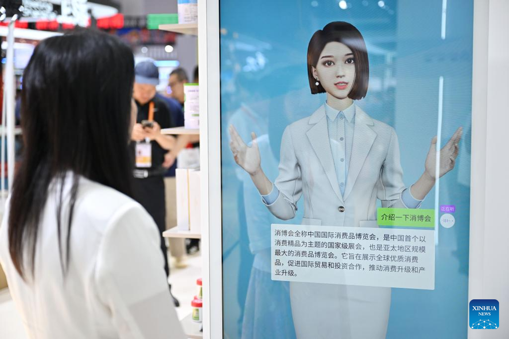 A virtual human based on artificial intelligence (AI) technology answers a question of a visitor at the fourth China International Consumer Products Expo (CICPE) in Haikou, capital city of south China's Hainan Province, April 15, 2024. At the ongoing expo in Hainan, AI technology products have attracted numerous visitors interested in smart innovations. (Xinhua/Guo Cheng)