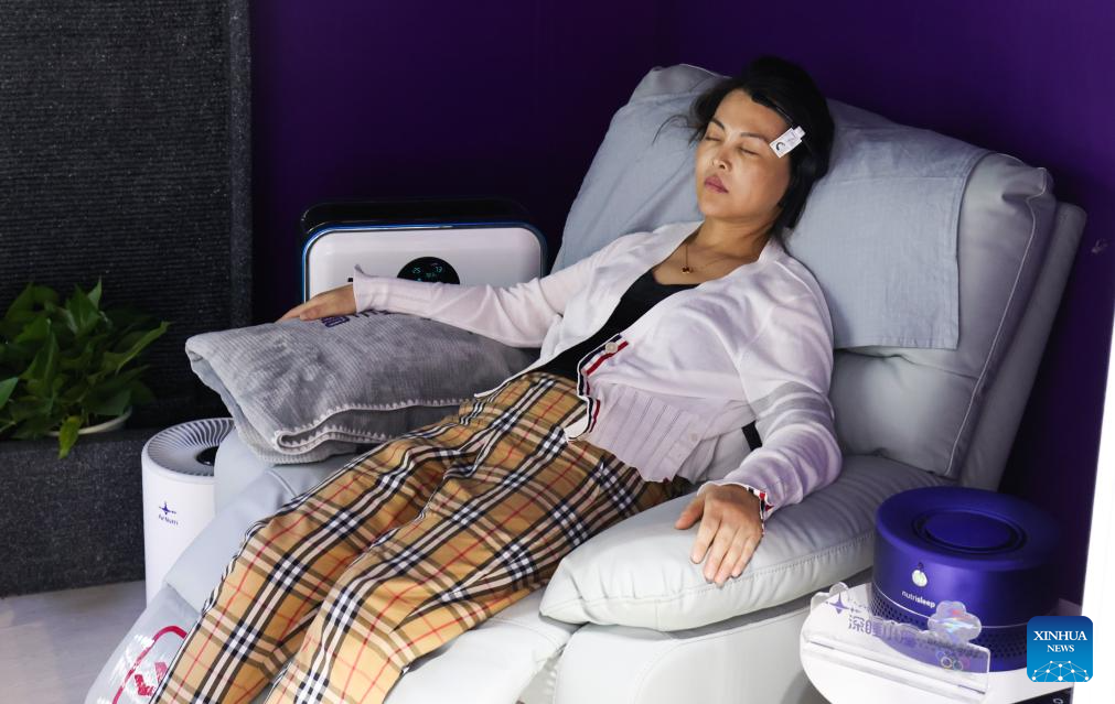 A visitor tries a sleep aid device at the fourth China International Consumer Products Expo (CICPE) in Haikou, capital city of south China's Hainan Province, April 16, 2024. At the ongoing expo in Hainan, AI technology products have attracted numerous visitors interested in smart innovations. (Xinhua/Yang Guanyu)