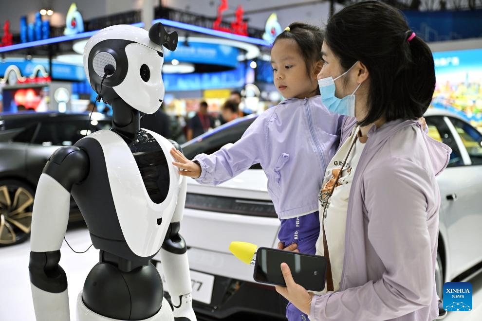 A girl interacts with an artificial intelligence (AI) robot at the fourth China International Consumer Products Expo (CICPE) in Haikou, capital city of south China's Hainan Province, April 15, 2024. At the ongoing expo in Hainan, AI technology products have attracted numerous visitors interested in smart innovations. (Xinhua/Guo Cheng)