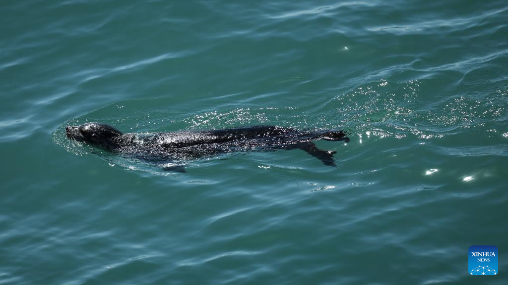 A released spotted seal swims in the waters off Dalian, northeast China's Liaoning Province, April 16, 2024. (Xinhua/Pan Yulong)