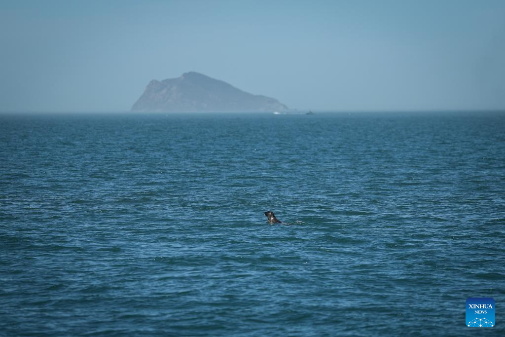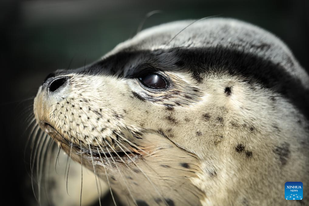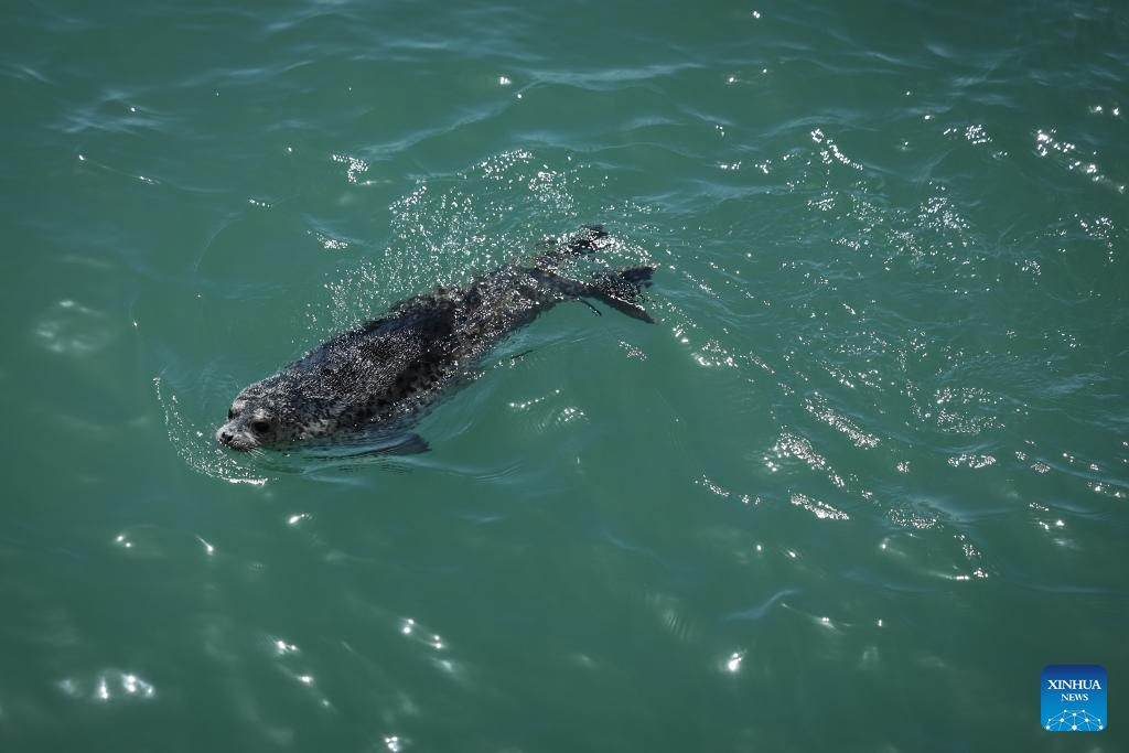 A spotted seal is pictured during a releasing event in Dalian, northeast China's Liaoning Province, April 16, 2024. (Xinhua/Pan Yulong)