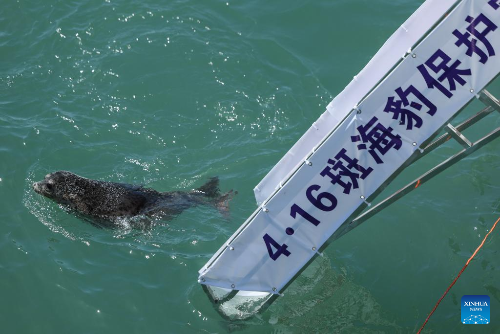 A spotted seal is released into the waters off Dalian, northeast China's Liaoning Province, April 16, 2024. (Xinhua/Pan Yulong)