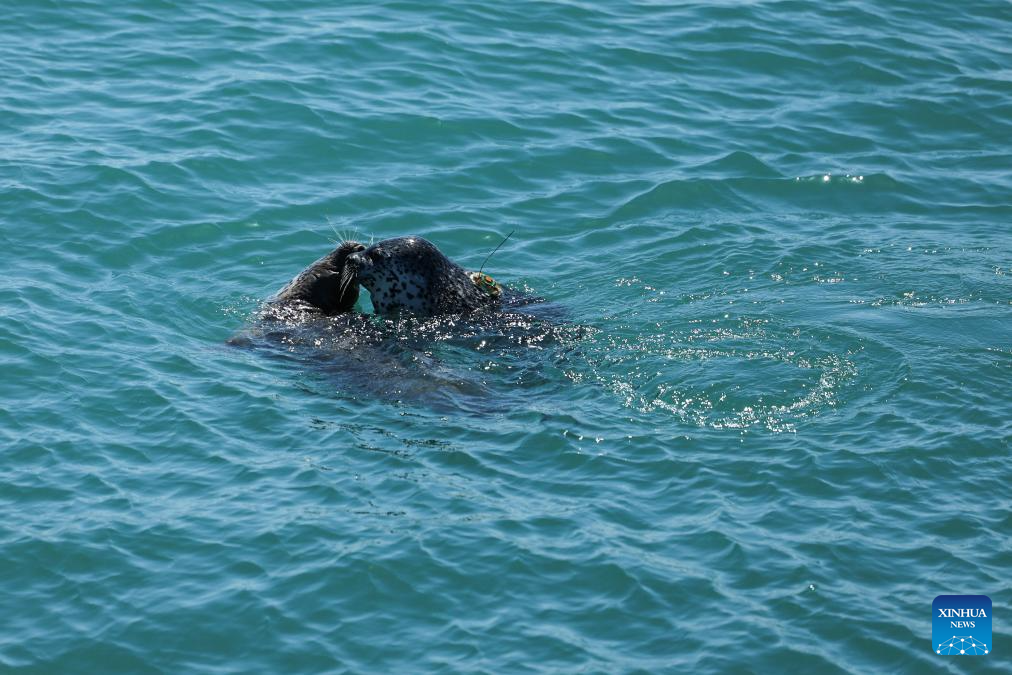Released spotted seals swim in the waters off Dalian, northeast China's Liaoning Province, April 16, 2024. (Xinhua/Pan Yulong)