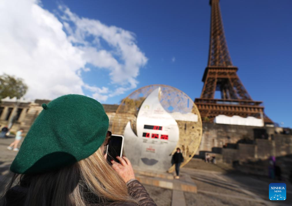 A tourist poses for photos with a countdown clock for the Paris 2024 Olympic Games in front of the Eiffel Tower in Paris, France, April 16, 2024. (Xinhua/Gao Jing)