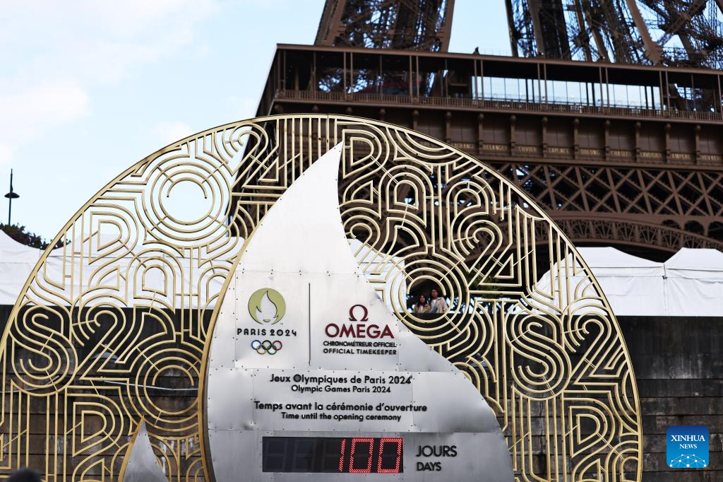 This photo taken on April 16, 2024 shows a countdown clock for the Paris 2024 Olympic Games in front of the Eiffel Tower in Paris, France. (Xinhua/Gao Jing)