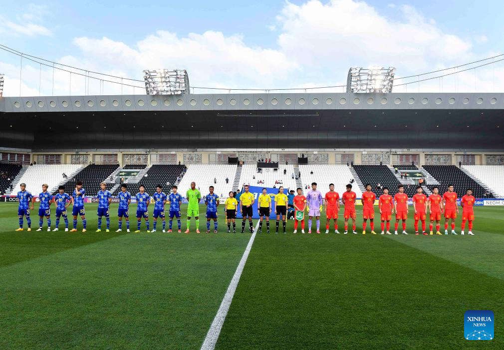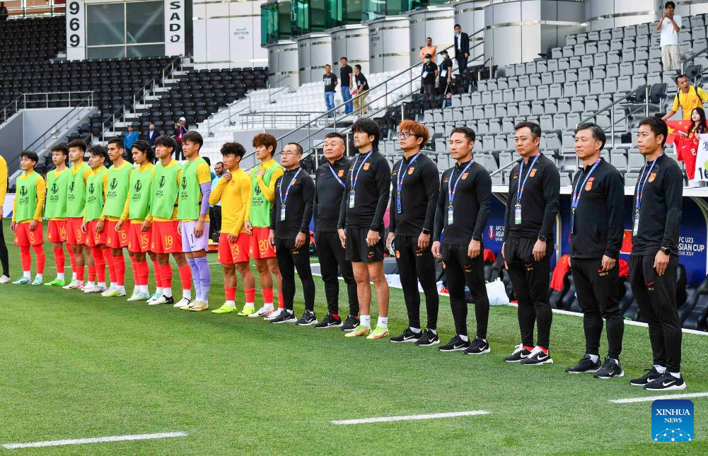 Substitutes and coaches of China line up for national anthems before the Group B football match between China and Japan of AFC U23 Asian Cup Qatar 2024 at Jassim Bin Hamad Stadium in Doha, Qatar, April 16, 2024. (Photo by Nikku/Xinhua)