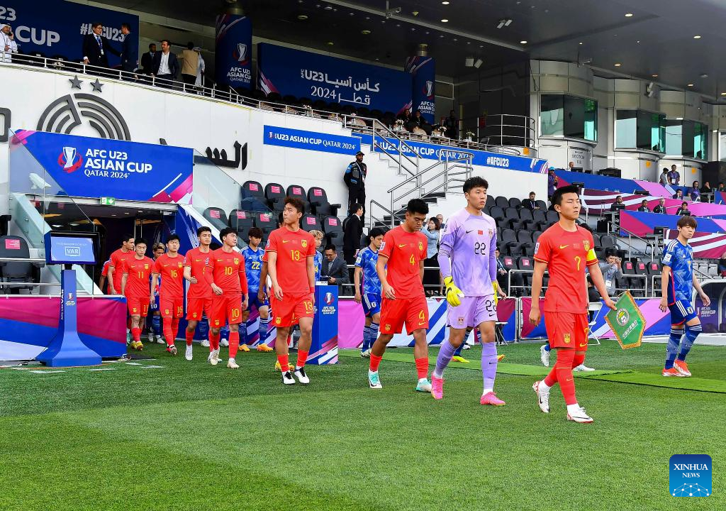 Players enter the pitch prior to the Group B football match between China and Japan of AFC U23 Asian Cup Qatar 2024 at Jassim Bin Hamad Stadium in Doha, Qatar, April 16, 2024. (Photo by Nikku/Xinhua)