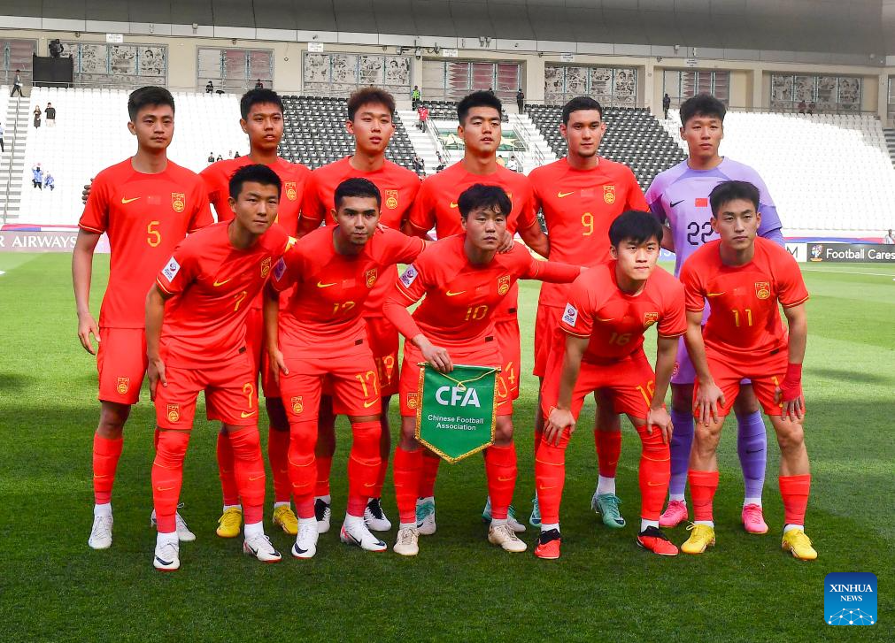 Starting players of China line up prior to the Group B football match between China and Japan of AFC U23 Asian Cup Qatar 2024 at Jassim Bin Hamad Stadium in Doha, Qatar, April 16, 2024. (Photo by Nikku/Xinhua)