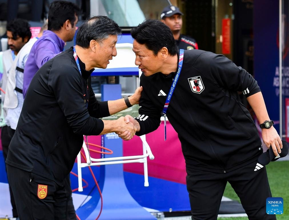 China's head coach Cheng Yaodong (L) shakes hand with Japan's head coach Oiwa Go prior to the Group B football match between China and Japan of AFC U23 Asian Cup Qatar 2024 at Jassim Bin Hamad Stadium in Doha, Qatar, April 16, 2024. (Photo by Nikku/Xinhua)