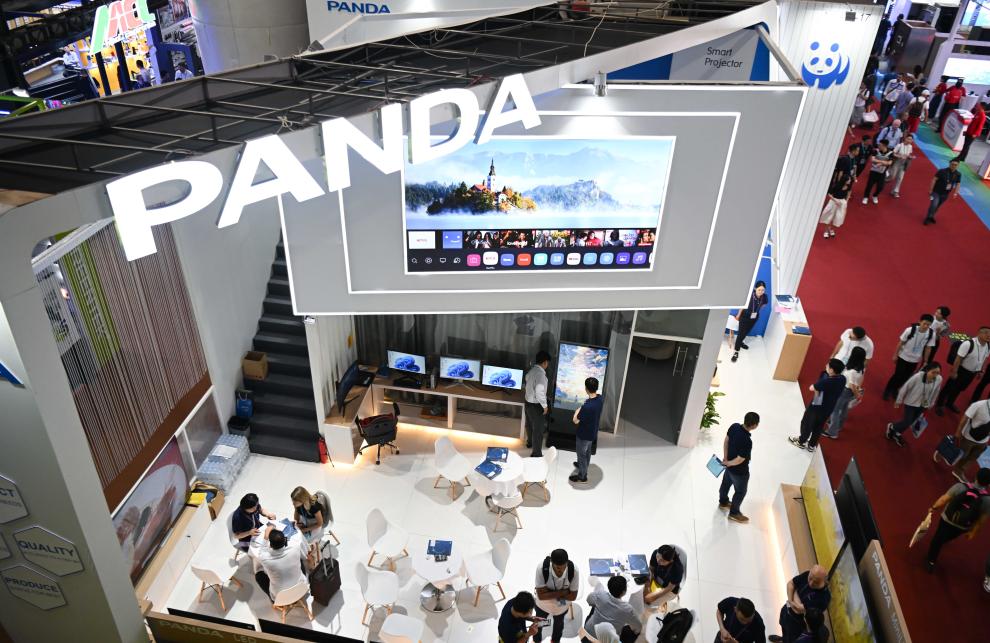 People learn about TV products of Panda at the 135th session of the China Import and Export Fair, also known as the Canton Fair, in Guangzhou, south China's Guangdong Province, April 17, 2024. The 135th session of the Canton Fair opened Monday in Guangzhou. The smart life product zone of the fair attracted nearly 200 exhibitors and numerous visitors. (Xinhua/Deng Hua)