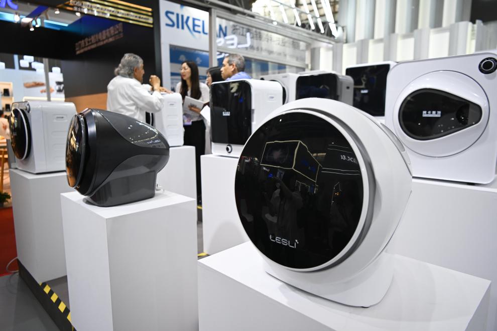 Dryers are displayed at the 135th session of the China Import and Export Fair, also known as the Canton Fair, in Guangzhou, south China's Guangdong Province, April 15, 2024. The 135th session of the Canton Fair opened Monday in Guangzhou. The smart life product zone of the fair attracted nearly 200 exhibitors and numerous visitors. (Xinhua/Deng Hua)