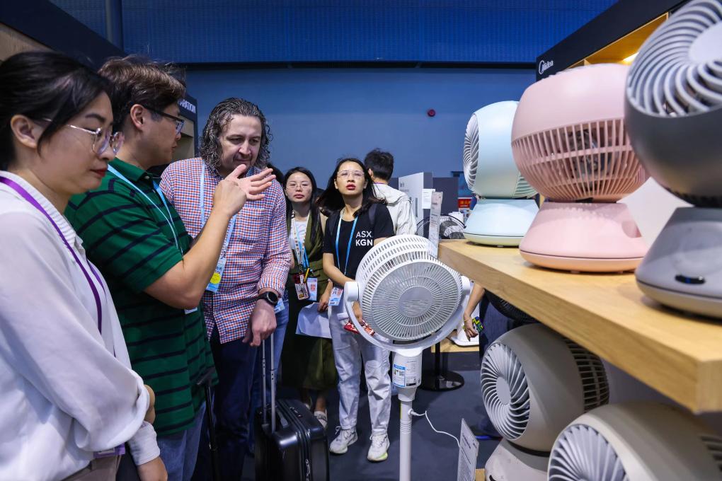 Buyers from Australia learn about electric fans at the 135th session of the China Import and Export Fair, also known as the Canton Fair, in Guangzhou, south China's Guangdong Province, April 15, 2024. The 135th session of the Canton Fair opened Monday in Guangzhou. The smart life product zone of the fair attracted nearly 200 exhibitors and numerous visitors. (Xinhua/Liu Dawei)