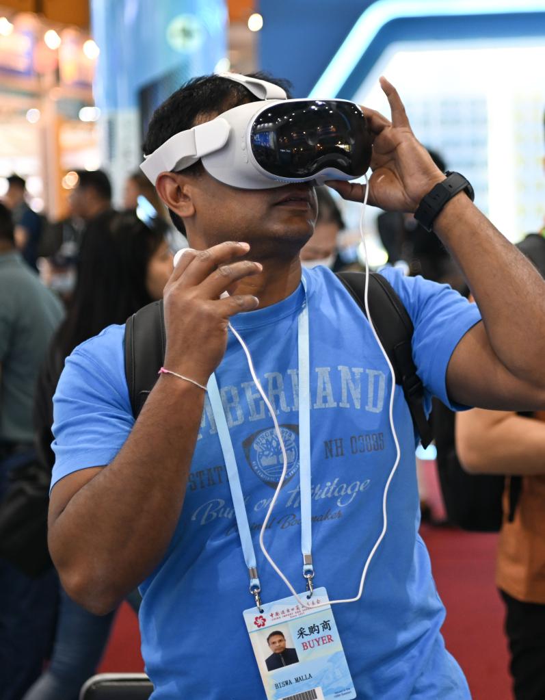 A buyer tries a virtual reality headset at the 135th session of the China Import and Export Fair, also known as the Canton Fair, in Guangzhou, south China's Guangdong Province, April 17, 2024. The 135th session of the Canton Fair opened Monday in Guangzhou. The smart life product zone of the fair attracted nearly 200 exhibitors and numerous visitors. (Xinhua/Deng Hua)