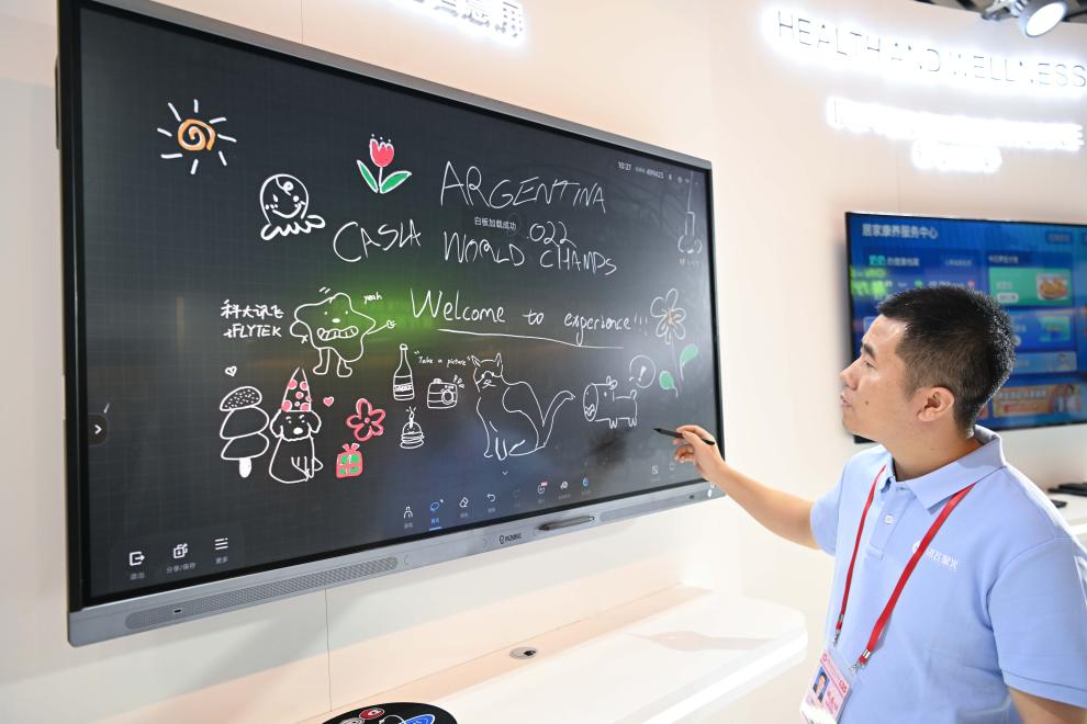 A staff member of iFLYTEK displays a smart screen at the 135th session of the China Import and Export Fair, also known as the Canton Fair, in Guangzhou, south China's Guangdong Province, April 17, 2024. The 135th session of the Canton Fair opened Monday in Guangzhou. The smart life product zone of the fair attracted nearly 200 exhibitors and numerous visitors. (Xinhua/Deng Hua)