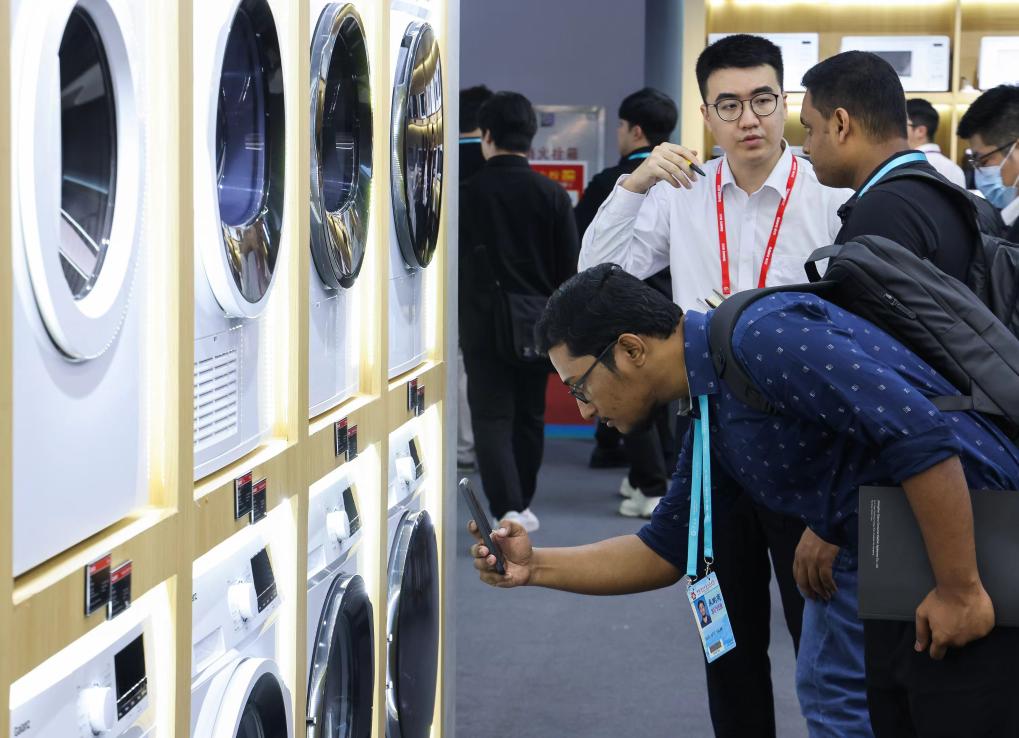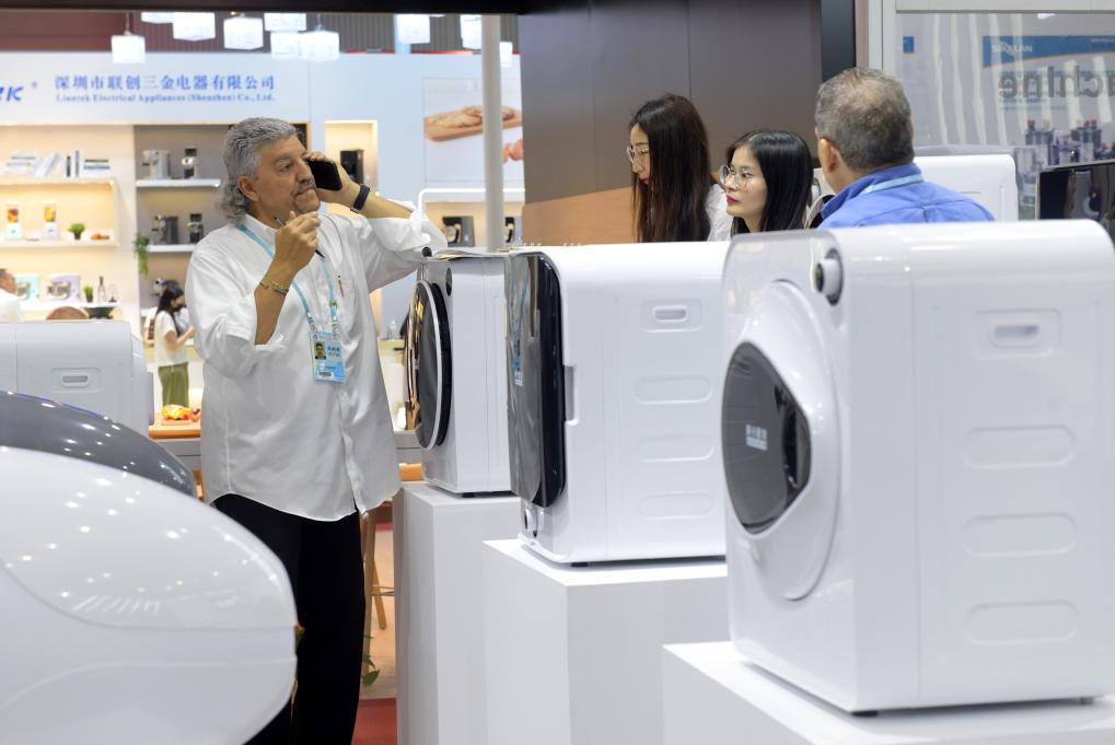 Buyers from Bangladesh learn about household electrical appliances at the 135th session of the China Import and Export Fair, also known as the Canton Fair, in Guangzhou, south China's Guangdong Province, April 15, 2024. The 135th session of the Canton Fair opened Monday in Guangzhou. The smart life product zone of the fair attracted nearly 200 exhibitors and numerous visitors. (Xinhua/Liu Dawei)