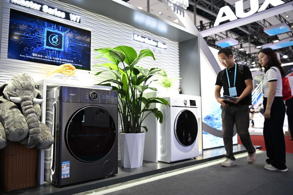 Visitors view Whirlpool washing machines at the 135th session of the China Import and Export Fair, also known as the Canton Fair, in Guangzhou, south China's Guangdong Province, April 17, 2024. The 135th session of the Canton Fair opened Monday in Guangzhou. The smart life product zone of the fair attracted nearly 200 exhibitors and numerous visitors. (Xinhua/Deng Hua)