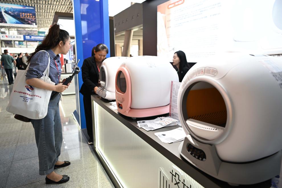 A visitor learns about smart cat litter box at the 135th session of the China Import and Export Fair, also known as the Canton Fair, in Guangzhou, south China's Guangdong Province, April 17, 2024. The 135th session of the Canton Fair opened Monday in Guangzhou. The smart life product zone of the fair attracted nearly 200 exhibitors and numerous visitors. (Xinhua/Deng Hua)