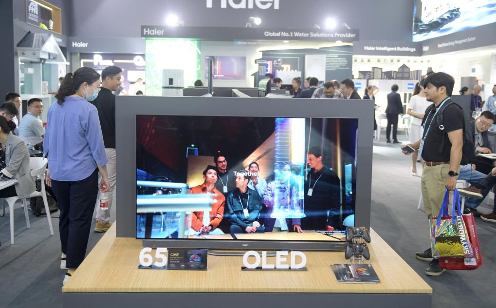 Buyers learn about Haier OLED TVs at the 135th session of the China Import and Export Fair, also known as the Canton Fair, in Guangzhou, south China's Guangdong Province, April 16, 2024. The 135th session of the Canton Fair opened Monday in Guangzhou. The smart life product zone of the fair attracted nearly 200 exhibitors and numerous visitors. (Xinhua/Lu Hanxin)