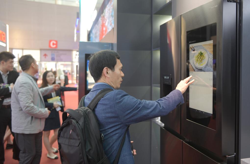 A buyer learns about a smart refrigerator of Hisense at the 135th session of the China Import and Export Fair, also known as the Canton Fair, in Guangzhou, south China's Guangdong Province, April 16, 2024. The 135th session of the Canton Fair opened Monday in Guangzhou. The smart life product zone of the fair attracted nearly 200 exhibitors and numerous visitors. (Xinhua/Lu Hanxin)